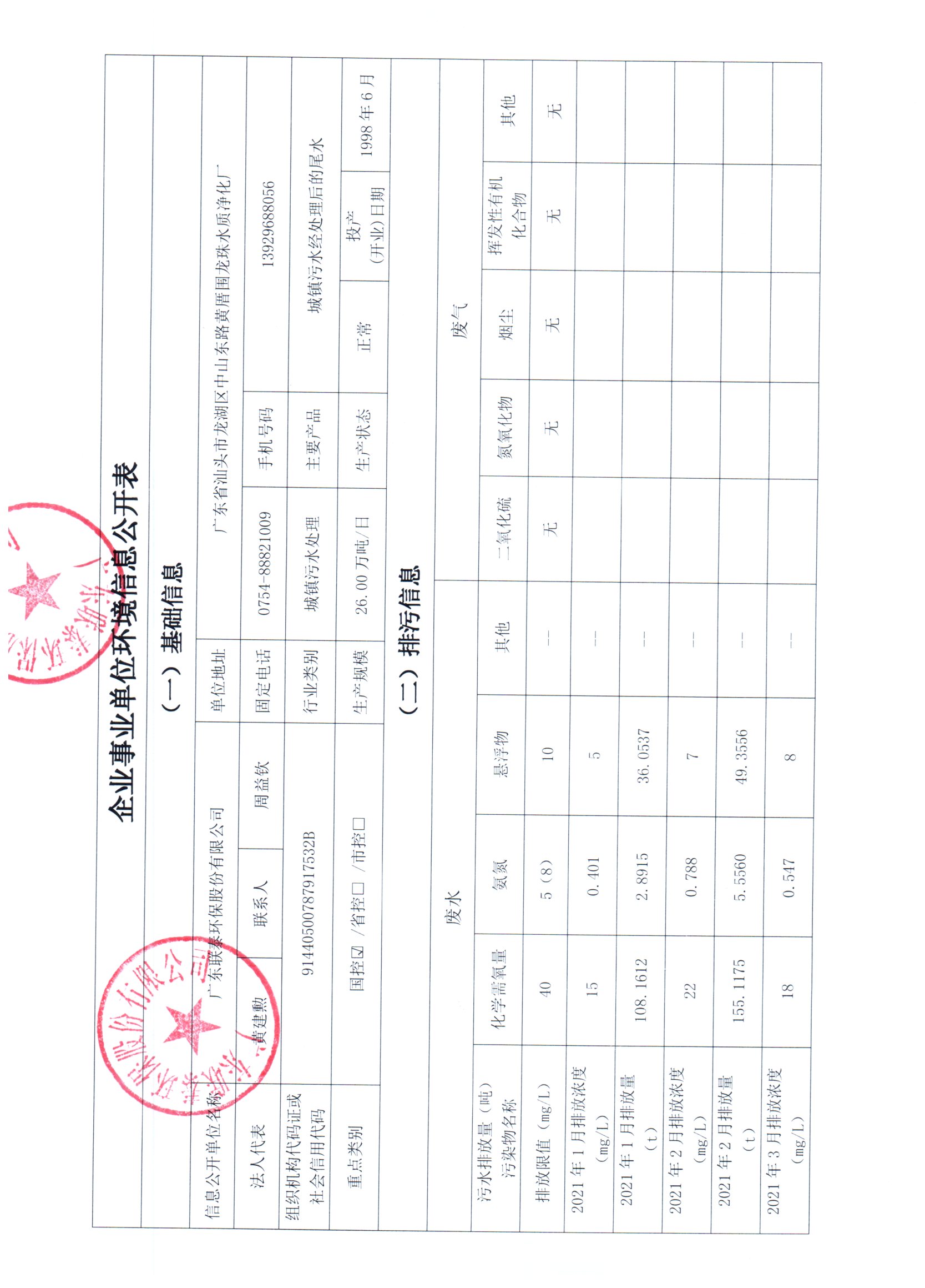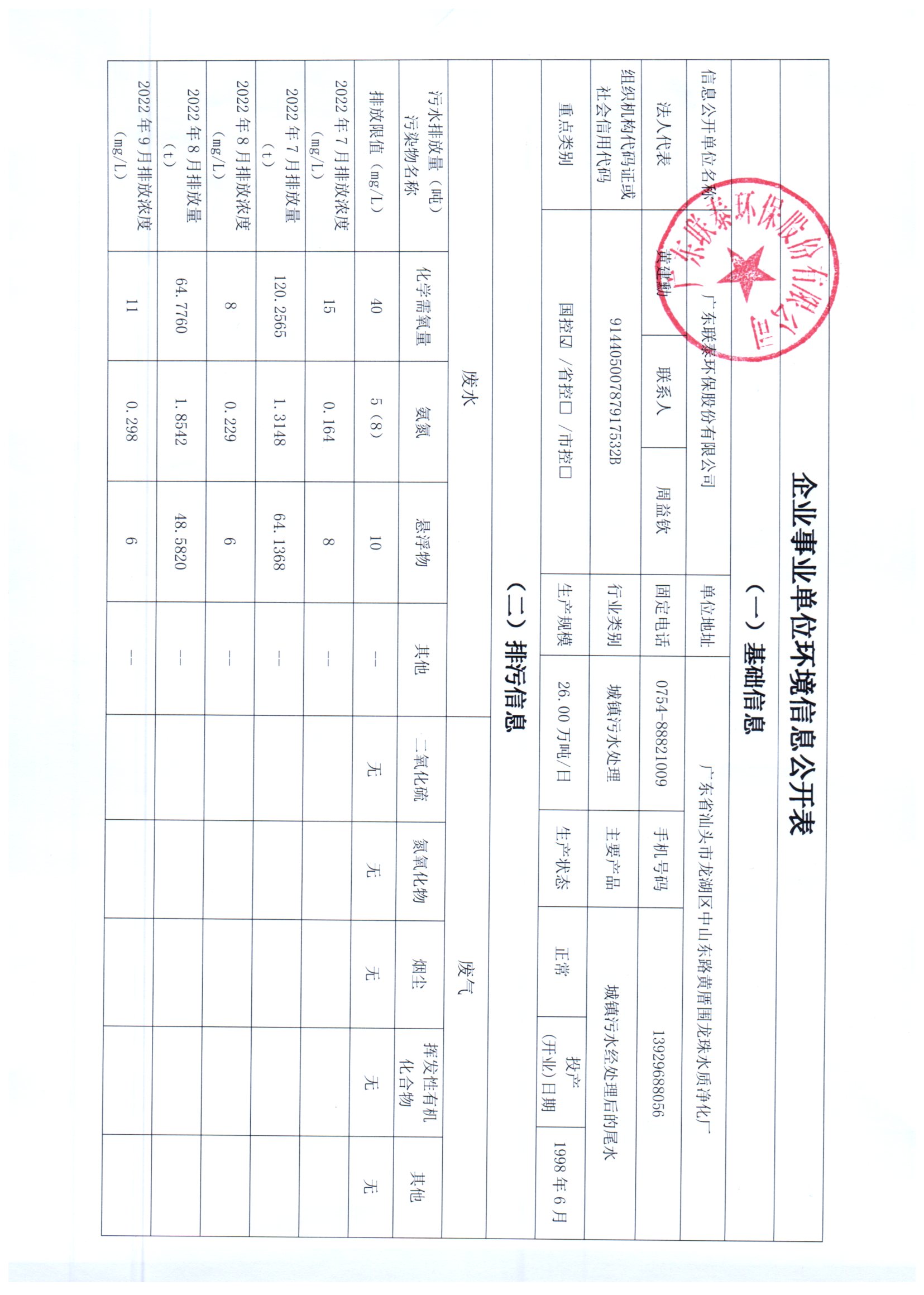 信息公開單位名稱: 廣東聯泰環保股份有限公司